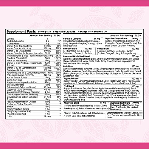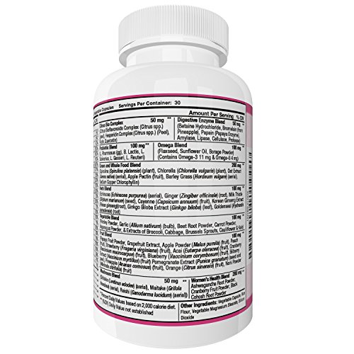 Whole Food Multivitamin Plus ProbioticThis Whole Food Multivitamin is formulated specifically for Women. Has everything you need for a daily boost of essential vitamins and minerals, with additional good-for-you Enzymes, Probiotics and Omegas. A Natural food blend of vegetables, fruits, herbs and mushrooms make this multivitamin easy to digest and absorb. Probiotic and Enzyme blends aid with digestion and help your body absorb more from your food throughout the day. This helps assure that nothing goes to waste! This multivitamin is designed to fill in the gaps your diet might miss. Premium Quality with Natural Whole food based supplements.