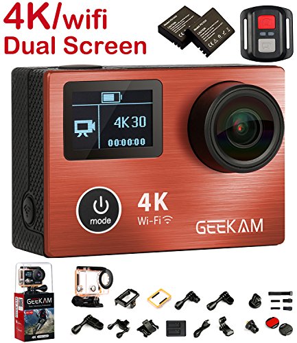 - ★ 170 DEGREE WIDE ANGLE & 100 FEET WATERPROOF & ACCESSORIES:170 degree wide angle lens allow you to record in a wide view angel. Equipped with IP68 waterproof case which allow you diving less than 100 feet beneath to record the beautiful ocean world. You will get 1x GEEKAM Action Camera, 1x 2.4G Remote Control, 2x 1050mAh Battery, 1x Waterproof Case, 1x Bicycle Stand, 7x Mount, 2x Clip, 1x Helmet Mount, 1x Bandage, 5x Tethers, 1 x Protective Backdoor, 1x Dual USB Wall Charger, 1x USB Cable