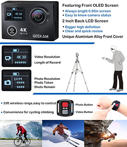 - ★ INNOVATION DUAL SCREEN & HIGH QUALITY ALUMINIUM ALLOY COVER: With status display screen in the front of the action camera, the original creation of Geekam, you can easily know the status of your action camera when recording. 2 inch LCD screen for easy and clear preview. The unique aluminium alloy front cover is high quality and fashion make Geekam sport camera stand out from the other action cameras in the market which all are plastic cover
