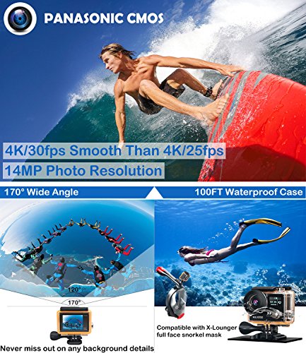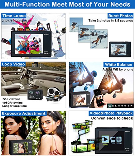 - ★ WIRELESS WRIST 2.4G REMOTE CONTROL & LONG-LASTING: Featuring a wrist 2.4G wireless RF remote control, framing shots or recording video are now ultra convenient-just press the button of the remote control. No more looking to your sports camera to start and stop recordings or snap photos. Our sports camera equip with two 1050 mAh battery each support continuous recording more than two hours in 1080P/60fps mode. dual USB wall charger for quick charge