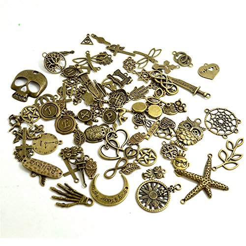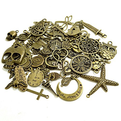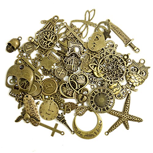 BronaGrand 100 Gram Assorted Antique Bronze Alloy Charms Pendants Beads Charms Chains Connectors for Crafting, Findings Jewelry Making DIY Accessory Mix 50-70pcs