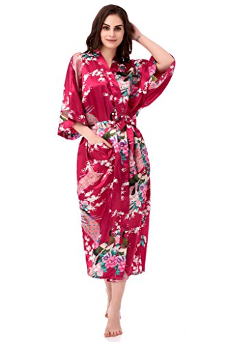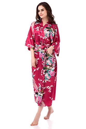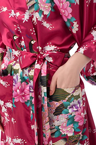 gusuqing Women's Kimono Long Robe - Peacock & Blossoms Long Kimono Robe With Pocket Burgundy