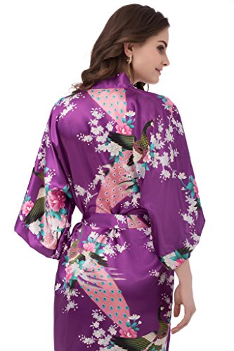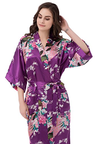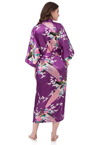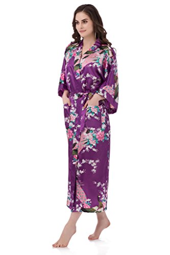 gusuqing Women's Kimono Long Robe - Peacock & Blossoms Long Kimono Robe With Pocket Plum