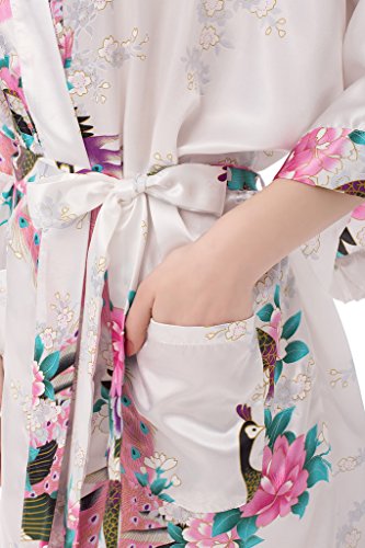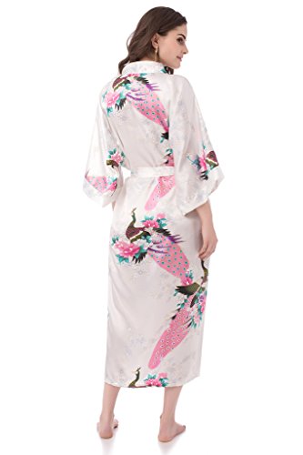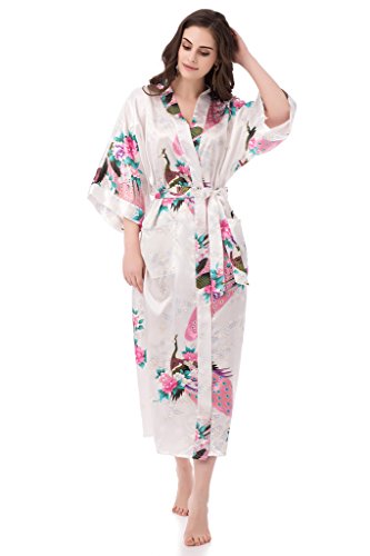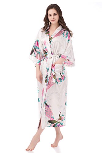 gusuqing Women's Kimono Long Robe - Peacock & Blossoms Long Kimono Robe With Pocket White