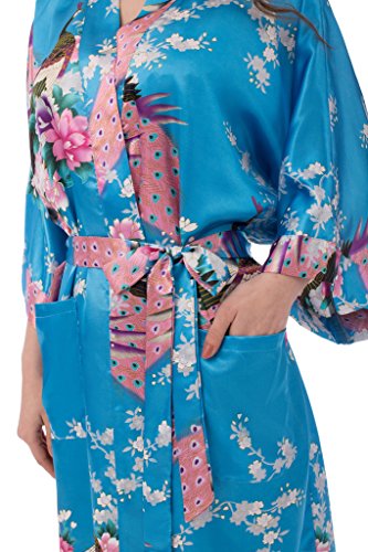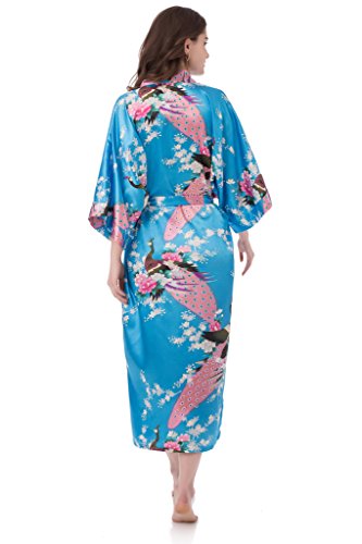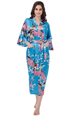 gusuqing Women's Kimono Long Robe - Peacock & Blossoms Long Kimono Robe With Pocket Turquoise