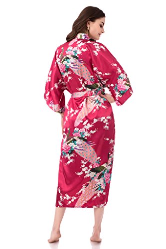 gusuqing Women's Kimono Long Robe - Peacock & Blossoms Long Kimono Robe With Pocket Magenta