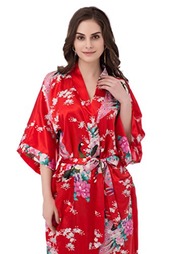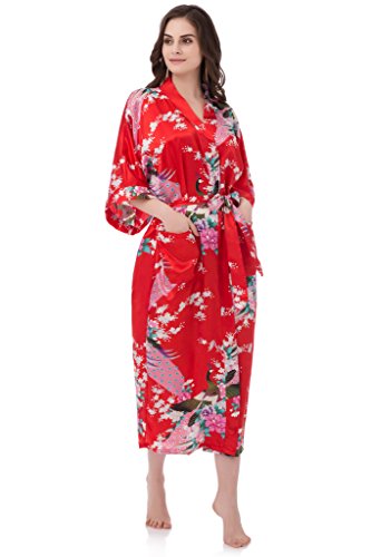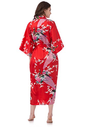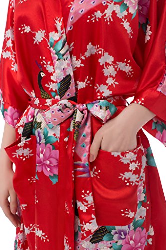 gusuqing Women's Kimono Long Robe - Peacock & Blossoms Long Kimono Robe With Pocket Red