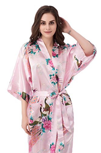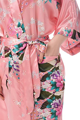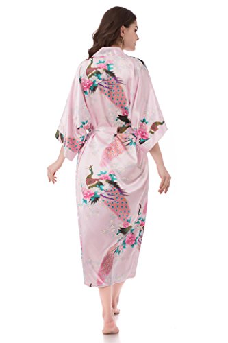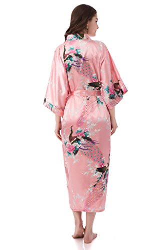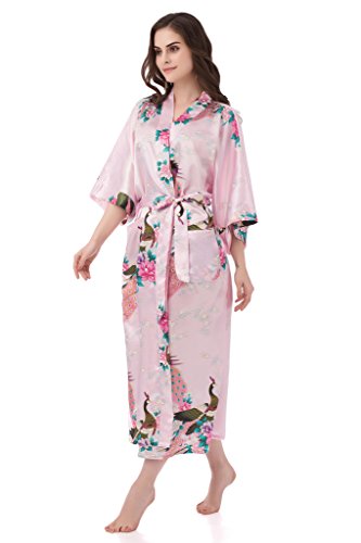 gusuqing Women's Kimono Long Robe - Peacock & Blossoms Long Kimono Robe With Pocket Pink