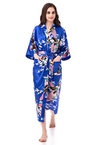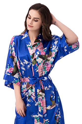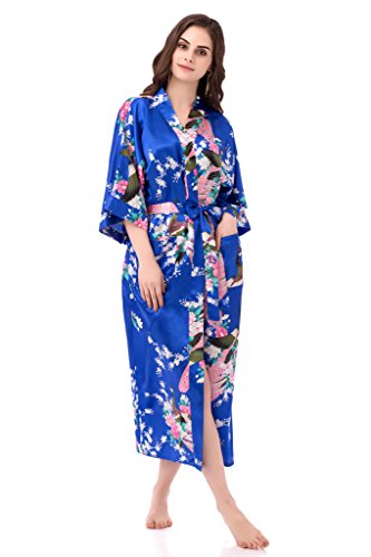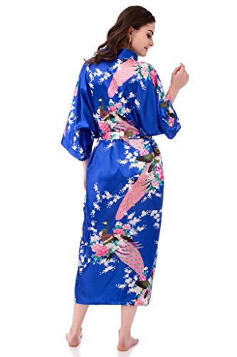 gusuqing Women's Kimono Long Robe - Peacock & Blossoms Long Kimono Robe With Pocket Royal Blue