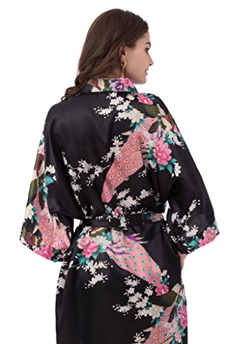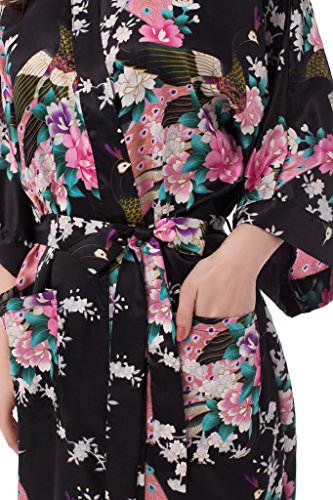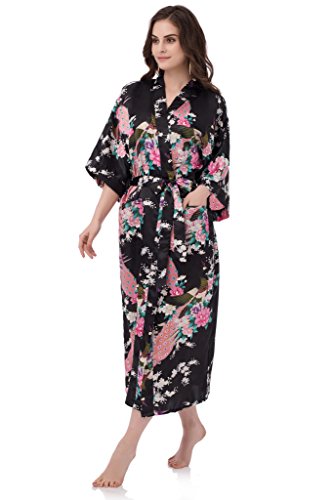 gusuqing Women's Kimono Long Robe - Peacock & Blossoms Long Kimono Robe With Pocket Black