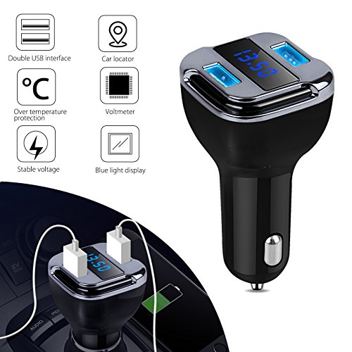 -. Feature : Dual Port Car Charger Fast Charge: 24W / 4.8A Dual USB car charger charges your favorite mobile devices high-speed including the iPad (max speed), iPhone (max speed), iPod, HTC, Galaxy, Blackberry, MP3 Players, Digital Cameras, PDAs, Mobile Phones. / Car Charger Voltmeter: automatically detect and display the car battery voltage and output voltage, it will display the output current when charging for devices. / Car Locator: supports APP finding car through GPS technology. When parking your car, it will automatically save the parking position. When you need find the car, just open the phone APP then you can find it easily. / Smart Charging Technology: dual-port smart charging design enable charge two devices at the same time. It can recognize your devices intelligently and charging perfectly by the fastest speed when being connected. / Compatible with: car phone charger simultaneous charges two devices. Work with Apple iPhone X / 8 / 7 / 6s / 5 / SE / Plus, iPad Pro / mini / Air, Samsung Galaxy s8 / S7 / S6 / Edge / Plus, Note, BlackBerry, Asus, LG, Nexus, HTC, Lenovo, Xiaomi, Moto, Huawei and More.