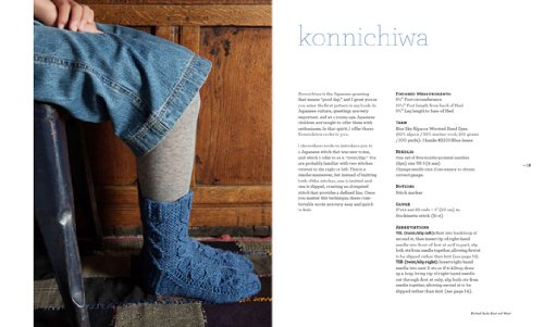 Whether short or long, fine or bulky, simple or complex, each of the 30 designs in Knitted Socks East and West is named afer an intriguing aspect of Japanese culture. For example, the leg of the Origami crew socks appears to fold in and out; the Sumo slipper socks are named after the heavy, organic movement of the cables in their thick yarn; and the Ikebana knee socks highlight a textural floral design. Step-by-step text and easy-to-read charts are included for each design, along with illustrated directions for the Japanese stitchwork introduced in the projects.