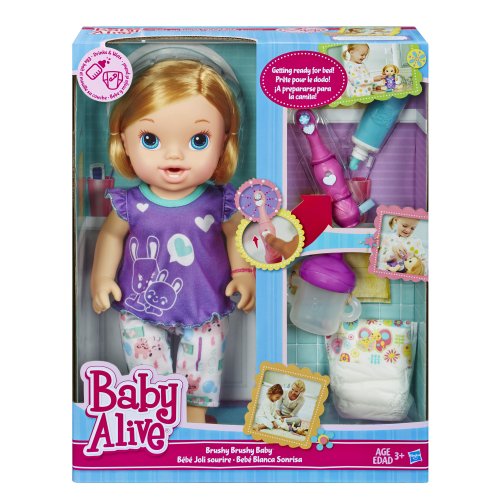 Baby Alive Brushy Brushy Baby Doll BlondeGetting ready for bed can be such a special time, especially with the Brushy Brushy Baby doll! Your little girl will love experiencing the fun of real babies when she helps this doll brush her teeth and get all ready for a nighttime snuggle. She can give her baby doll a bottle, change her diaper when she wets, and then get her all dressed in her adorable pajamas. It's bedtime for baby with the Brushy Brushy Baby doll!Baby Alive and all related characters are trademarks of Hasbro.