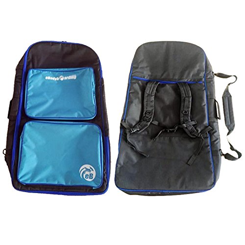 Studio : eBodyboarding Publisher : eBodyboarding Binding : Misc. Product Description Designed by two of bodyboarding's most renowned travelers, Jay and Vicki Reale have collaborated to bring you a bag ideal for your travel to any destination on the globe. We've combined all the best features of the bags we've seen over the years. The eBodyboarding.com 4-Board Travel Case is padded all around to protect from airline damage. One side of the bag zips completely open for easy interior access. It also features stow-away backpack straps ensuring minimal luggage snagging on the airport luggage systems. On top of all that, we have designed two heavy duty outer pockets and 3 inner pockets (2 mesh, 1 solid) to store all your personal belongings inside the bag without worries of losing anything. Water-resistant nylon outer pockets for great wet storage. Mesh drainage on the lower outer pocket. Bag is made of heavy duty 600D nylon and heavy-duty zippers, straps and stitching. All sides are well-cushioned with 5mm padding. Will fit three boards up to 46 in length or 4 boards up to 43 in length, or one 48 board along with 2 or 3 smaller boards 43 and below. Also fits two 45, one 43 and one 39. Padded carry handle along center of bag. Color: Black bag with blue piping and light blue pocket with white eBodyboarding.com logo. Interior dimensions: 46 long x 24 wide x 6 high 0