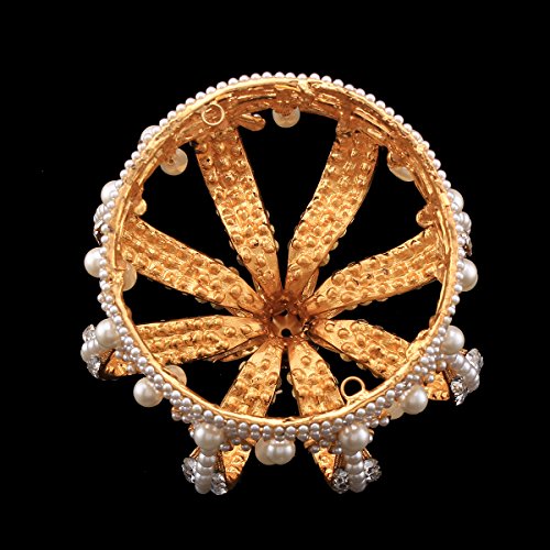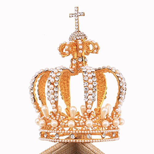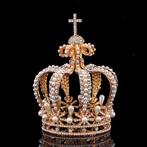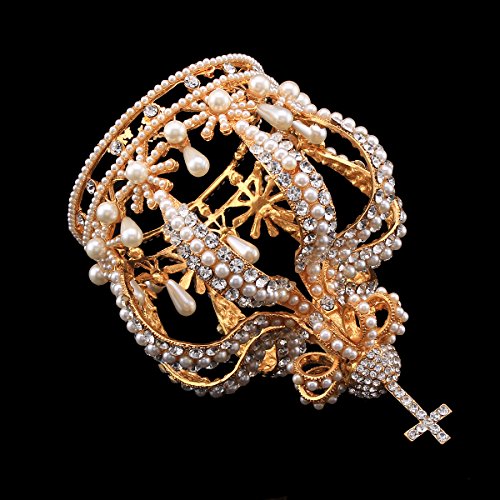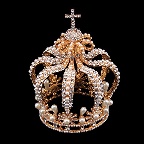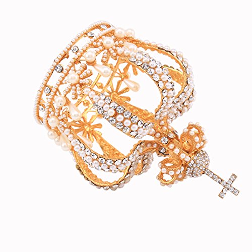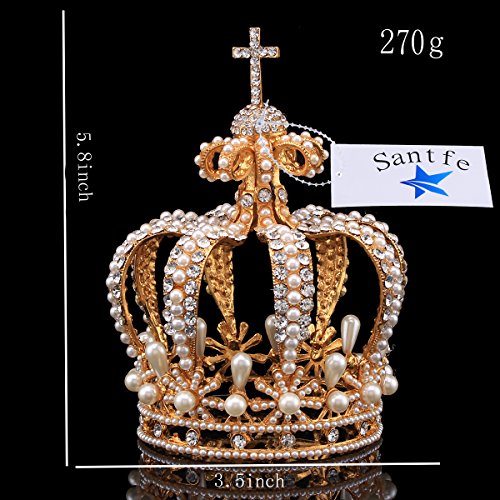 Santfe 3.5" Wide Royal Cross Style Crystal Faux Pearl Full Crown Princess Queen Hair Accessory (Gold)
