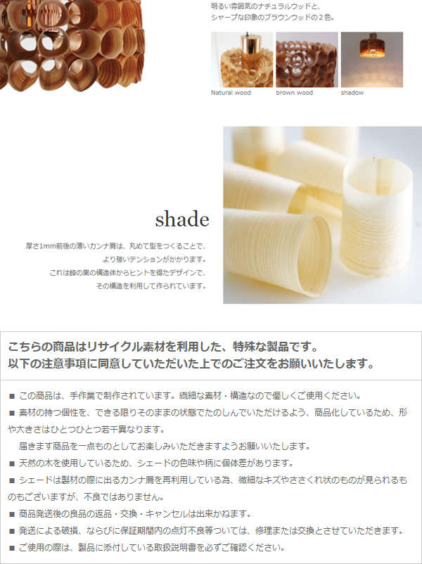 ●シェードの形状やサイズにばらつきがあります。シェードは製材の際にでるカンナ屑を再利用している為、シェードに微細な傷、ささくれ状のものが見られるものもありますが不良品ではありません。