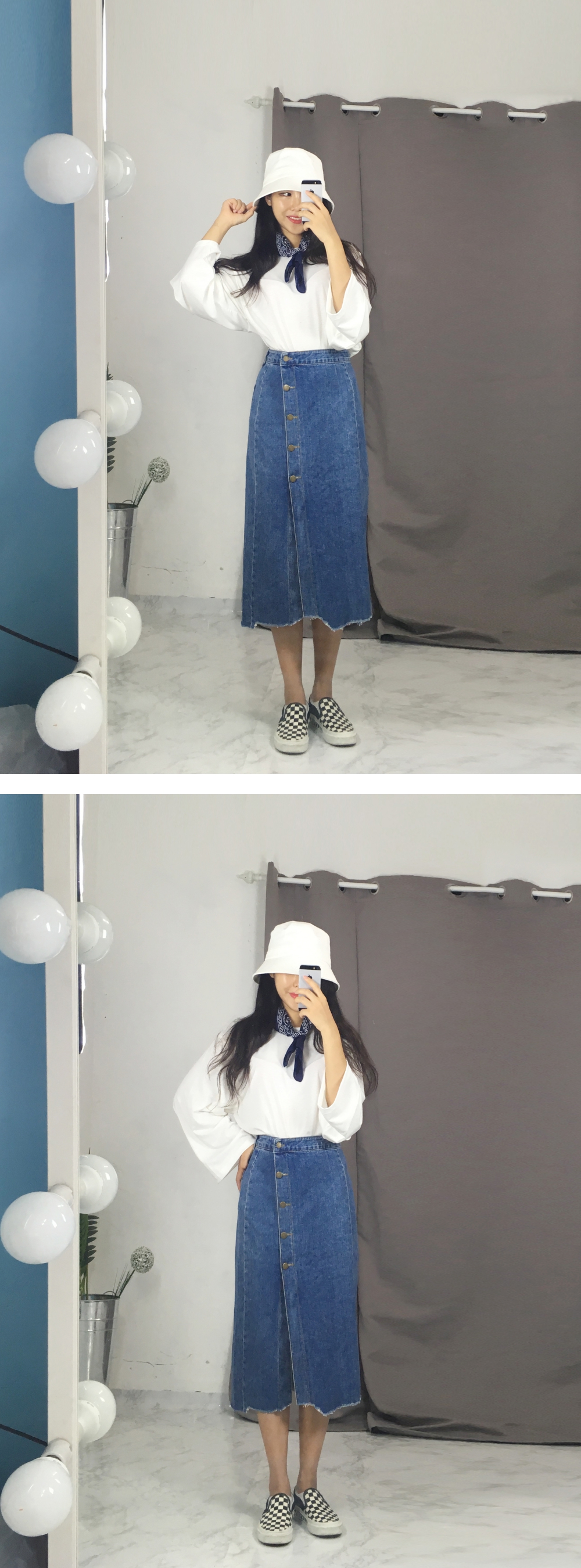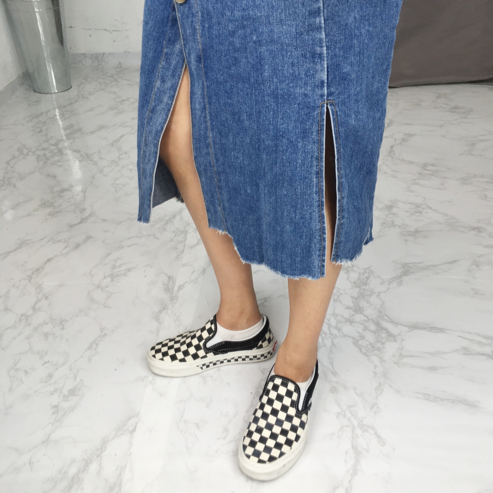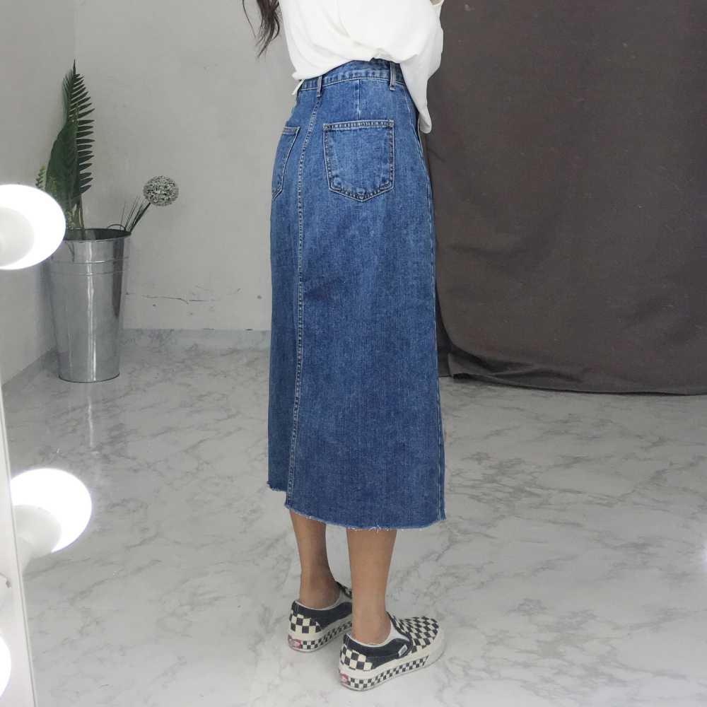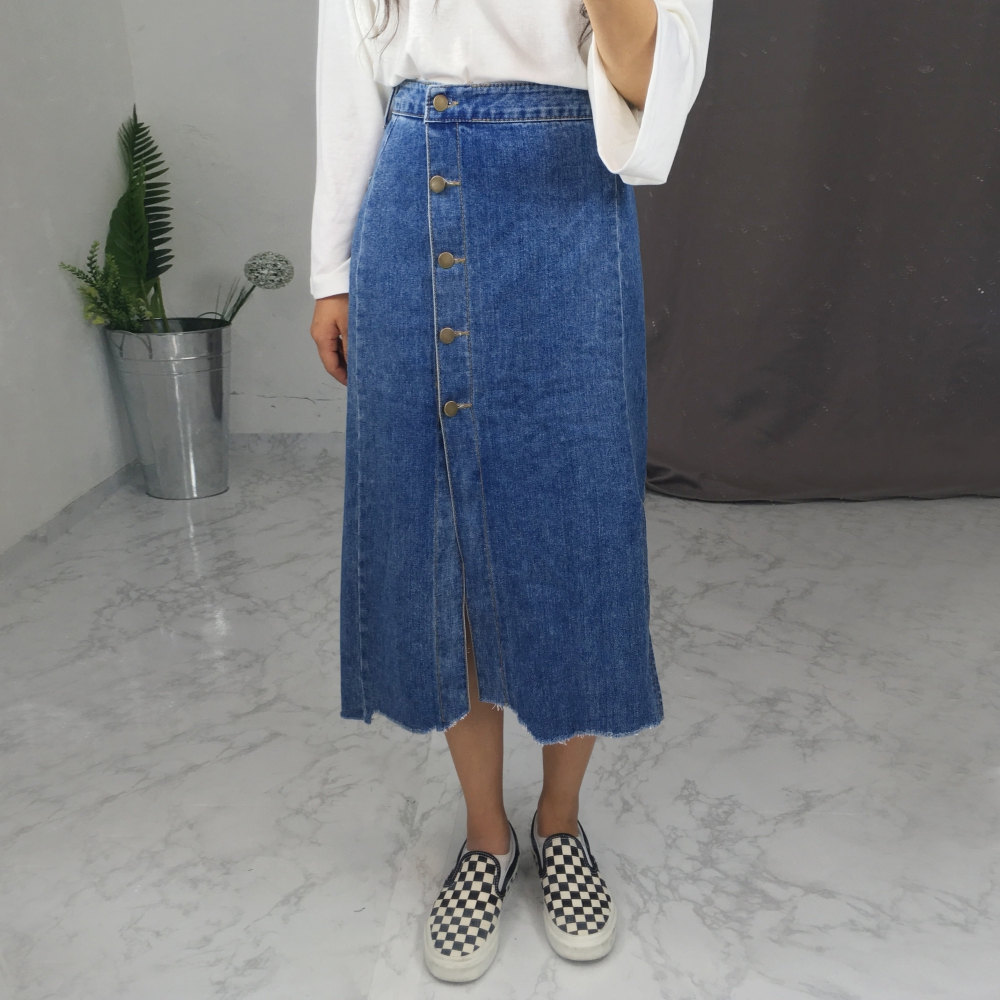 Long denim skirts that show off detail in 20's Women's autumn coordination look outlook look casual look