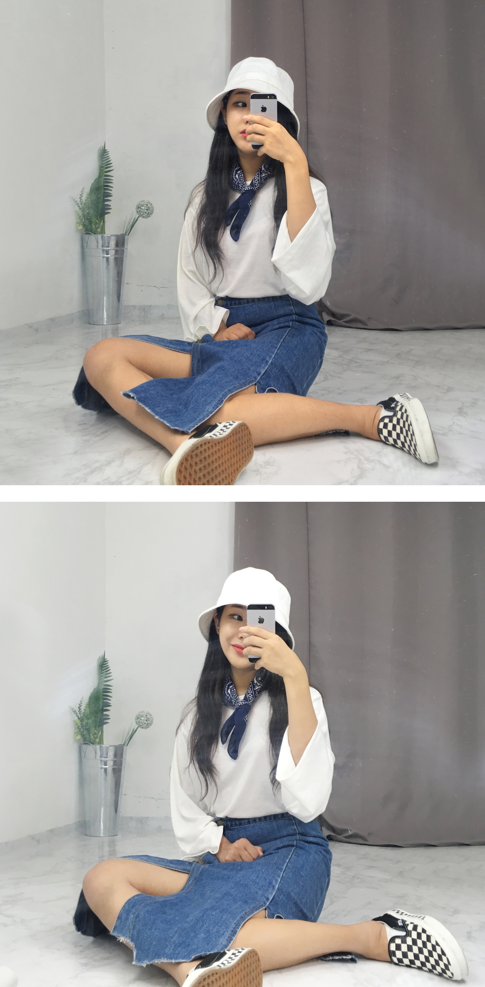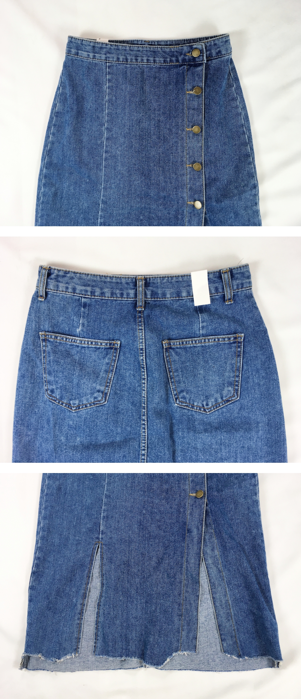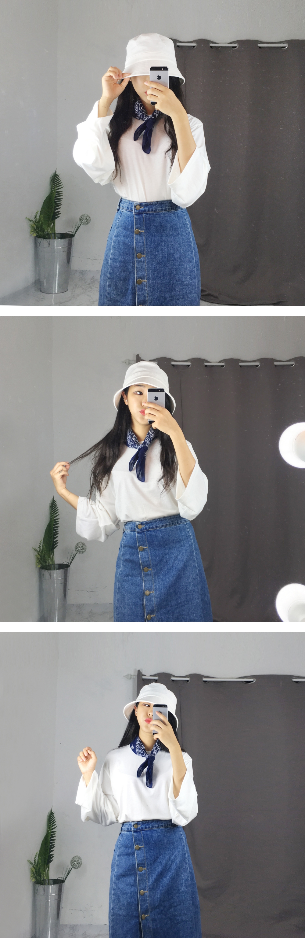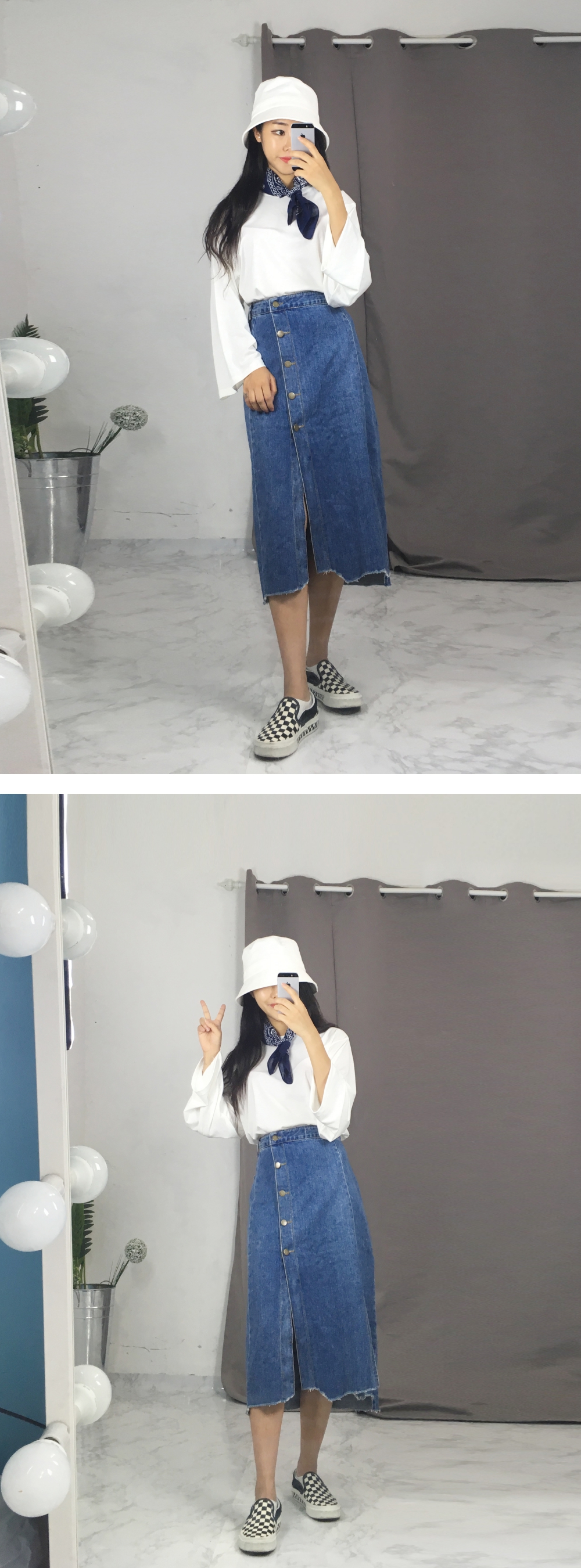 Long denim skirts that show off detail in 20's Women's autumn coordination look outlook look casual look