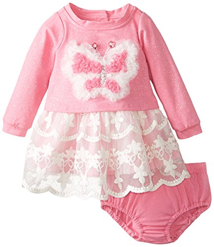Printed glitter top with butterfly applique and attached mesh skirt. Panty