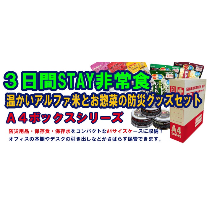 원본상품명: 備えて安心A4サイズBOX 3日間STAY非常食 ?かいアルファ米とお?菜の防災グッズセット(防災セット 避難セット 非常持ち出しセット 企業 ?? 法人 防災グッズ 非常持ち出し袋プロ推? 非常食 地震?策 一人用 アルファ米 10年保存水 ギフト)
