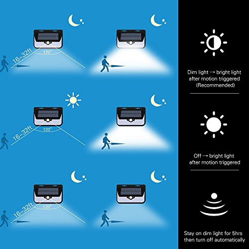 [3 INTELLIGENT LIGHT MODES] Super bright when motion detected, light turns dim after go away; Auto bright light up when motion detected; Auto on at dusk and off after 5 hours.