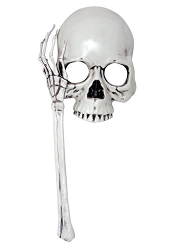-. Feature : Size: Standard / Adult Skull Mask on a Stick / Molded plastic mask covers upper portion of face / Stick that holds mask is shaped like a skeletal hand and forearm