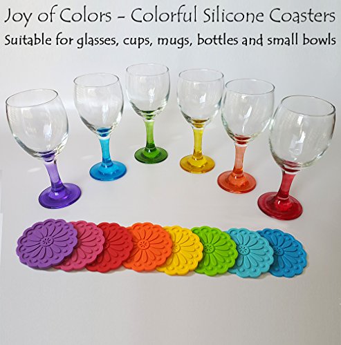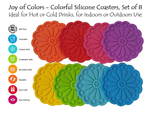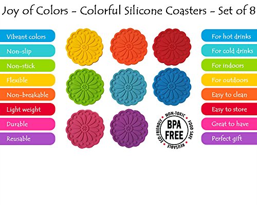 - Distinguish your drink with 8 eye-catching vibrant colors. Joy of Colors Colorful Silicone Coasters colors are: blue, turquoise, green, yellow, orange, red, dark pink, purple.