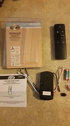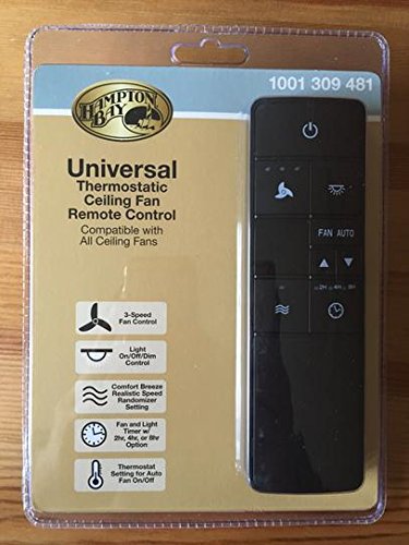 The Hampton Bay Universal Thermostatic ceiling fan remote control adds ultimate functionality to your ceiling fan. The thermostatic feature enables the user to set a desired room temperature range at which the fan will automatically turn on or off. The remote is able to control the speed of your fan as well as control the lights of the ceiling fan with On, Off, and dimming options. This ceiling fan remote control is easy to install and is compatible with LED, CFL, and incandescent light bulbs. The Thermostatic remote includes a walk away time delay feature that allows you to turn the light off but still have light as you leave the room. This remote control also includes a Comfort Breeze setting which randomly alternates the fan's speed to create an organic breeze effect. Walk away time delay. Comfort breeze setting. Fan and light timer with 2, 4 and 8 hours option. Compatible with most downrod style fans, not recommended for use with hugger style fans. Compatible with LED, CFL, and incandescent light bulbs. Easy set up.Feature
