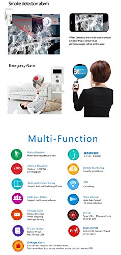 -. Feature : 1.System security Account, password authority management DDNS No need DDNS, support dynamic IP Mobile view HD mobile view, dedicated software for Iphone, Android(IOS4.3、Android OS 2.3 above) / 2. Local memory Support up to 32G TF Card, loop recording P2P Plug & Play technology applied. 99% penetration rate. Only three steps to view image. Server cluster Global PnP smart server cluster applied, high stability UID Technology UID scan technology applied, easy to operate, and highly confidential. / 3.Compression Format H.264 , 1.0 megapixel Frame rate 1~30fps Resolution 720P(1280*720)/VGA(640×480)/QVGA(320×240) image adjustment light intensity,contrast ratio,saturation level are adjustable. / 4.Image sensor 1/4 CMOS Minimum Illumination 2.5Lux( color mode), 0.3Lux (B/W mode) SNR ≥39dB / 5.Electronic shutter 1/50s(1/60s)-1/100,000s CMOS support AWB, AGC, BLC Lens/Viewing Angle 2.8mm @F1.4/75.6˚