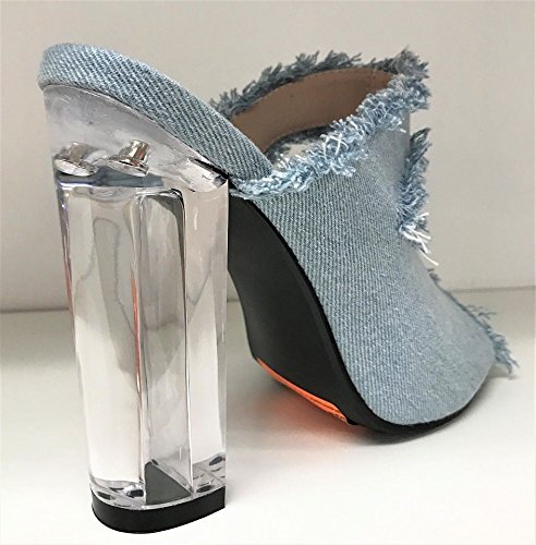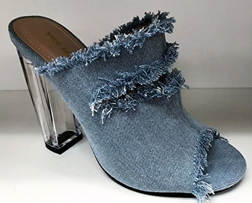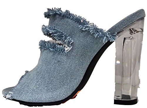 Shoe Republic Musse Open Toe Lucite Clear Perspex Block Heel Mule Slip On Shoe Denim Blue