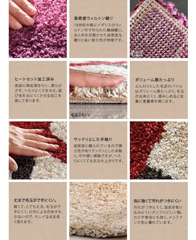 商品について:水面のようなデザインを高密度なウィルトン織りで仕上げたラグです。高密度に織られ、弾力性がありサックリとした手触り。ヒートセット加工を行うことでへたりを抑え、遊び毛が出にくくなりました♪床暖房、ホットカーペット対応