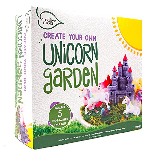 Foster your child's imagination and creativity with the Creative Roots create your own unicorn garden! create a miniature magical world for display or imaginary play. Introduce your child to gardening by incorporating colorful flowers and easy-to-care-for plants to enhance your Unicorn's magical world! kit includes: 10-inch plastic planter, Castel, 2 unicorn figurines, Toadstool figurine, and a butterfly.Feature