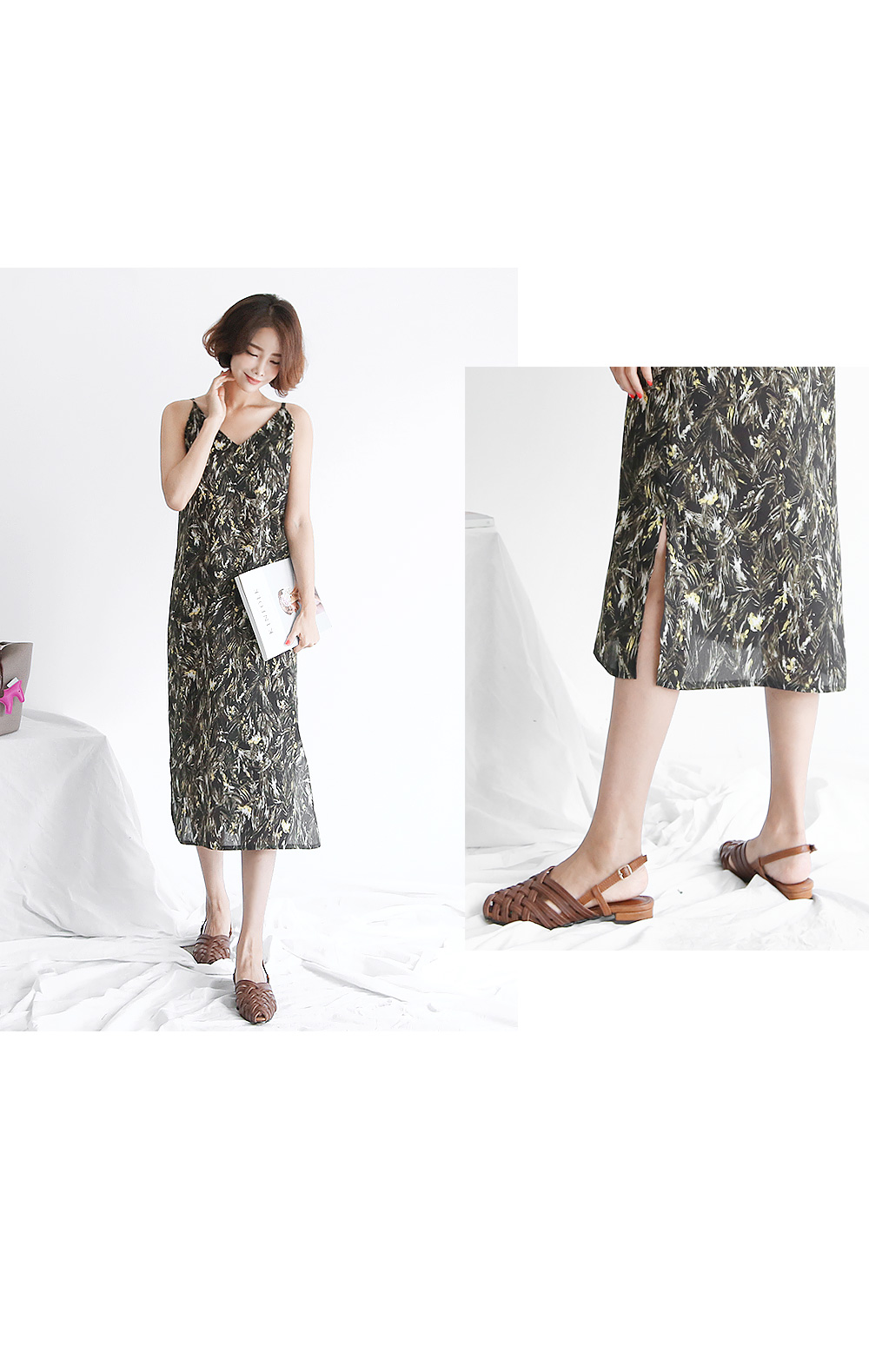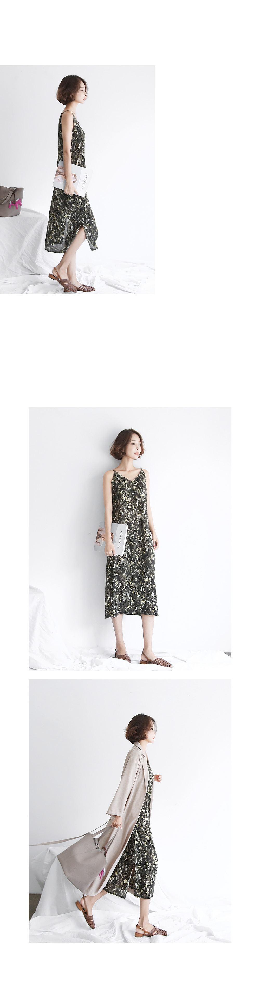 화려한 나염의 슬립형 원피스입니다