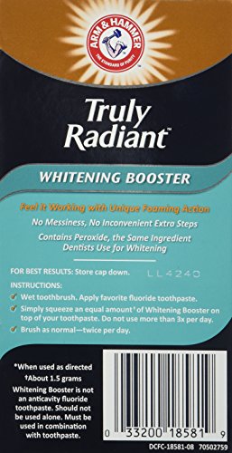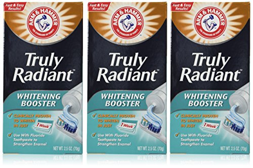 -. Binding : Health and Beauty -. Brand : Arm & Hammer -. EAN : 0765857717180 -. Feature : Easier, faster and 3X more whitening agent than a leading whitening strip*. / Simply apply ARM & HAMMER® Whitening Booster over your toothpaste and brush as normal. That's it. No extra steps and no mess. / It starts working immediately and gets teeth up to 4 shades whiter?, all for a fraction of the cost of a leading strip. ; -. IsAdultProduct : 0 -. Label : Arm & Hammer -. Manufacturer : Arm & Hammer -. MPN : 033200185819 -. PackageQuantity : 3 -. PartNumber : 033200185819 -. ProductGroup : Beauty -. ProductTypeName : HEALTH_PERSONAL_CARE -. Publisher : Arm & Hammer -. Size : Pack of 3 -. Studio : Arm & Hammer -. Title : Arm & Hammer Whitening Booster, 2.5 Ounce (Pack of 3) -. UPC : 765857717180