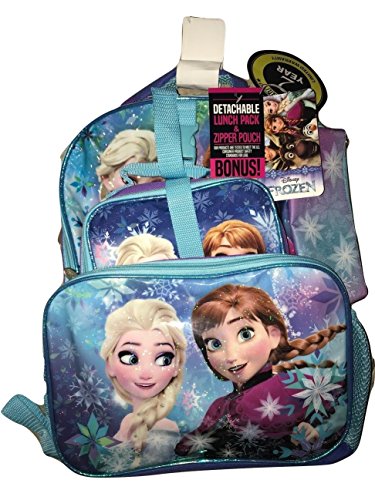 -. Brand : Disney -. Color : Blue -. EAN : 0693186432668 -. Feature : Stylish Disney Frozen Back Pack with favorite characters Anna and Elsa / Includes detachable lunch bag, which is secured by a strap / Includes detachable pencil case / Great for Preschool and Kindergarten Schools / Plenty of pace with Front Zip Pocket, Side Pockets, Padded Shoulder Strap, Mesh Pocket -. ProductGroup : Apparel -. ProductTypeName : LUGGAGE -. Title : Disney Frozen Backpack -. UPC : 693186432668