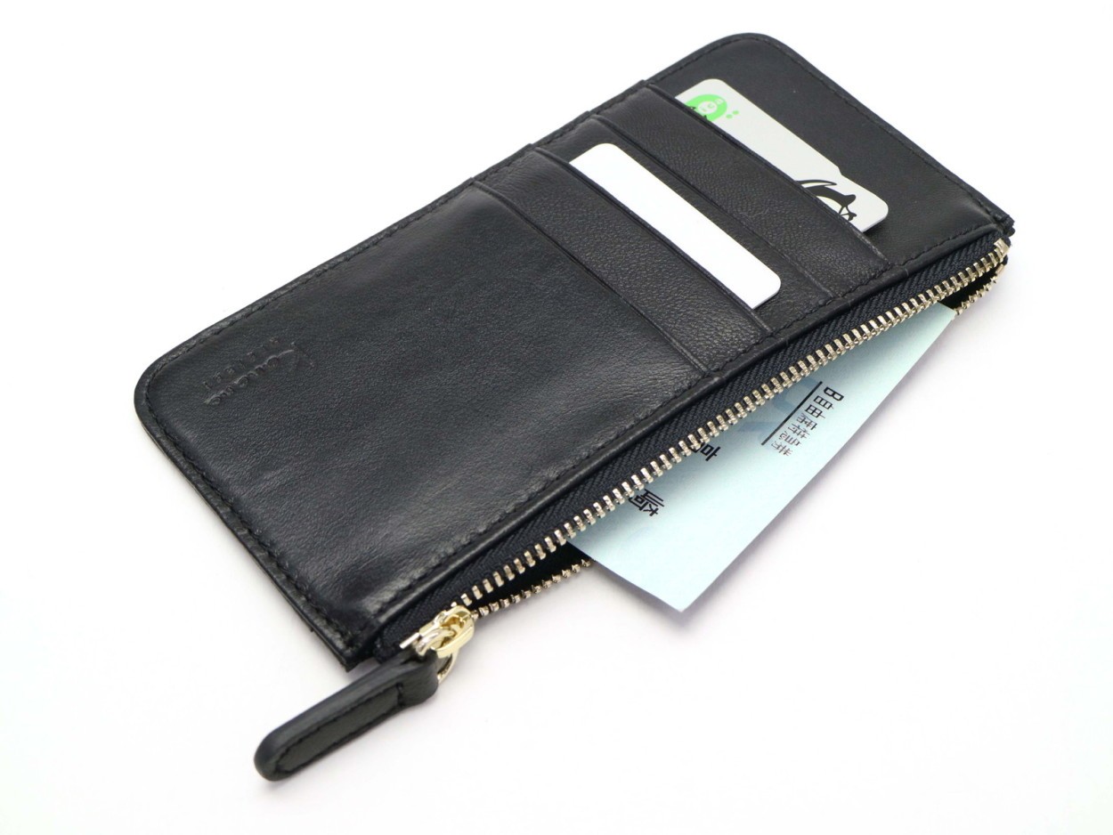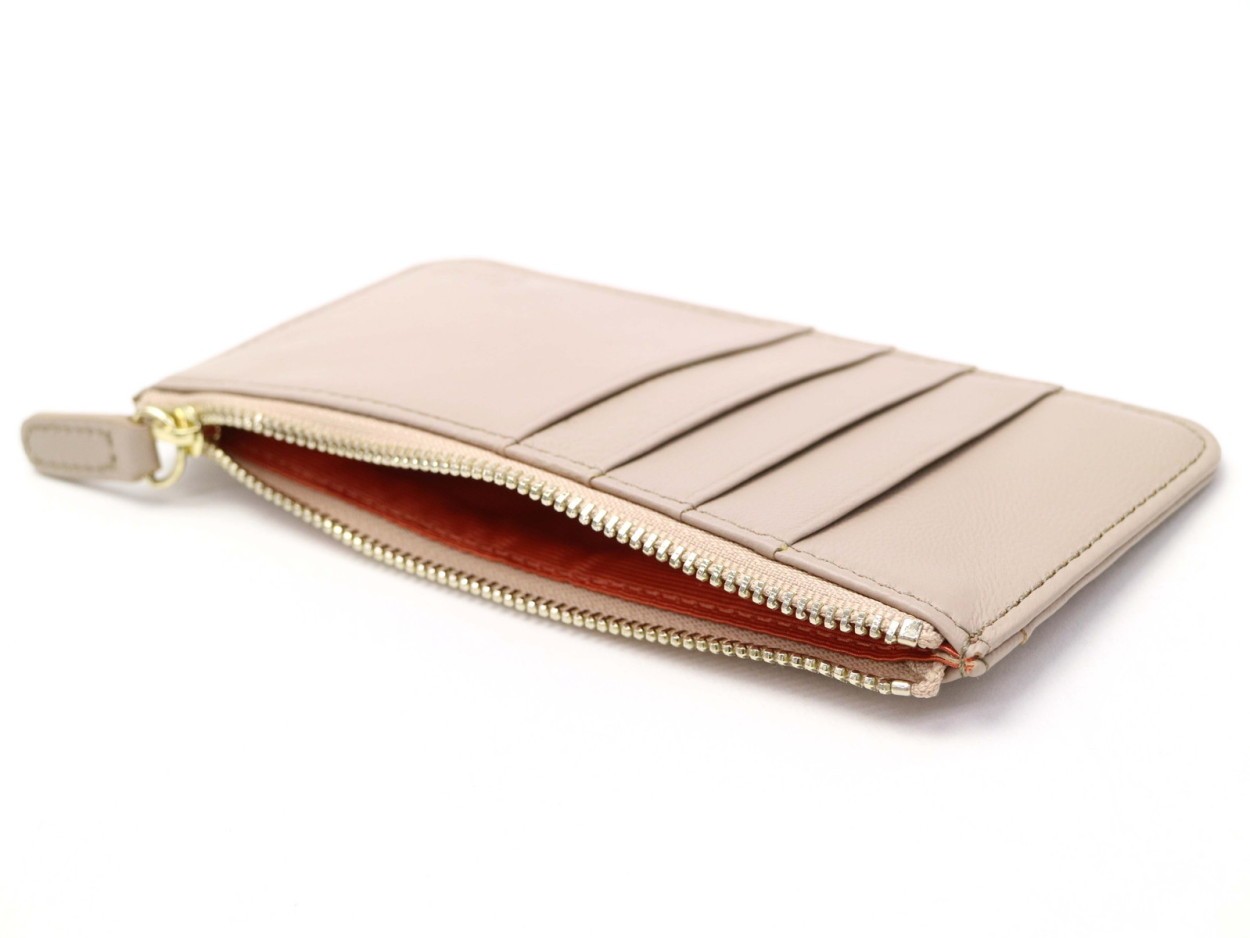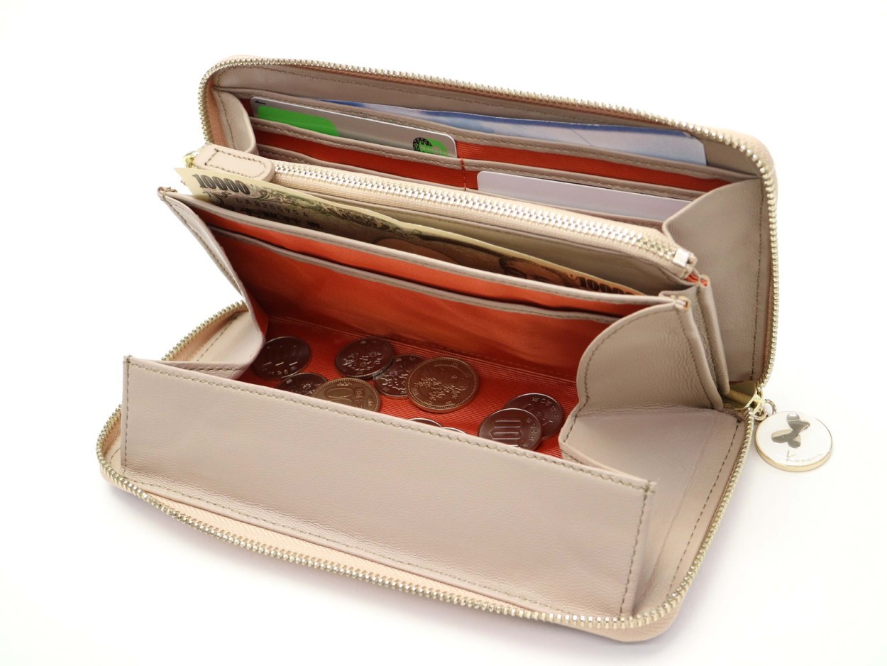 カードポケットが奥まで見やすいよう、広めに開く設計に。一番手前の収納は大きく開き見やすいため、小銭入れに最適です。