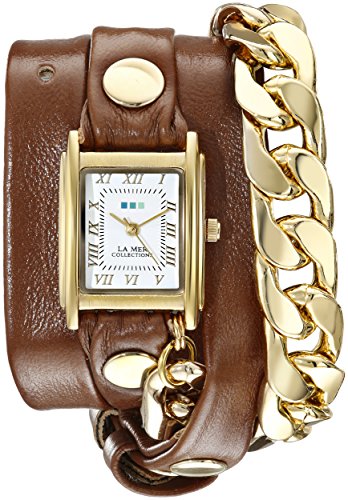 -. Binding : Watch -. Brand : La Mer Collections -. Department : womens -. EAN : 0819007011335 -. Feature : Gold-tone watch featuring square dial with Roman numeral hour markers and three-hand movement / 23 mm gold-tone stainless steel case with mineral dial window / Japanese quartz movement with analog display / Wrap-around leather band with stud accents, attached curb chain, and buckle closure / Water resistant to 10 m (33 ft): In general, withstands splashes and rain, but not immersion -. Label : La Mer Collections -. Manufacturer : La Mer Collections -. Model : LMSCW4001 -. MPN : LMSCW4001 -. PartNumber : LMSCW4001 -. ProductGroup : Watch -. ProductTypeName : WATCH -. Publisher : La Mer Collections -. ReleaseDate : 2013-03-15 -. Studio : La Mer Collections -. Title : La Mer Collections Women's LMSCW4001 Malibu Gold-Tone Watch with Wrap-Around Leather Band -. UPC : 819007011335
