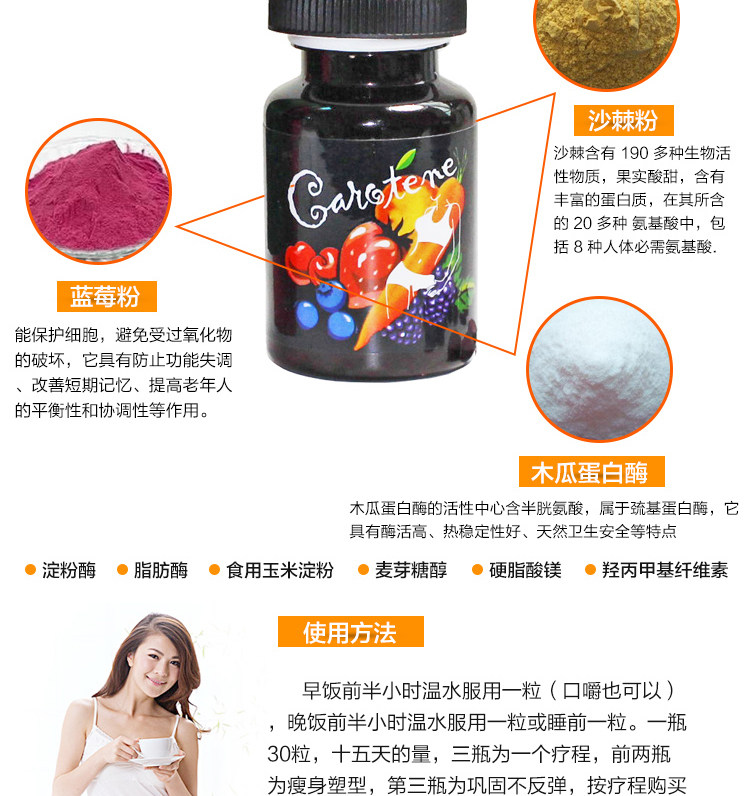 [Ingredients] blueberry powder, sea buckthorn powder, papain, amylase, lipase, maltitol, hydroxypropyl methyl cellulose and the like.