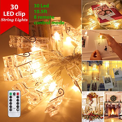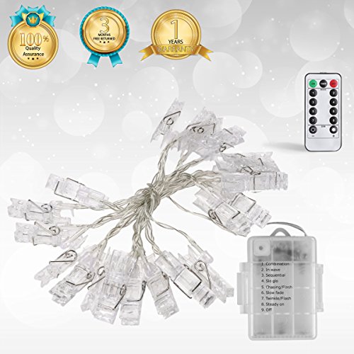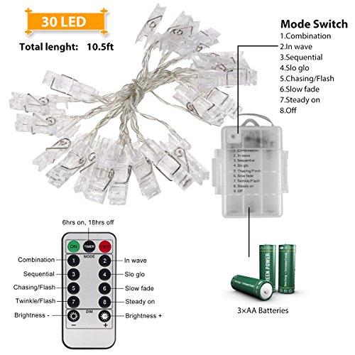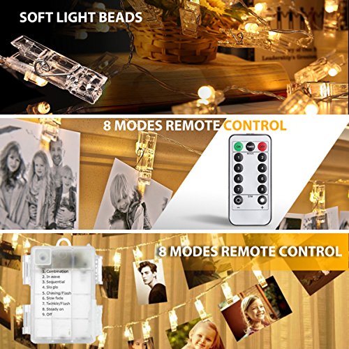 - ❤【8 Light Modes With Remote Control】Our photo clip string lights provide 8 lighting modes: Combination (flash from mode 2 to 7 at random), In Waves, Sequential, Slo-gol, Chasing/Flash, Slow Fade, Twinkle/Flash, Steady On. Smart Timer Program: 6 hours on, 18 hours off, cycle daily.