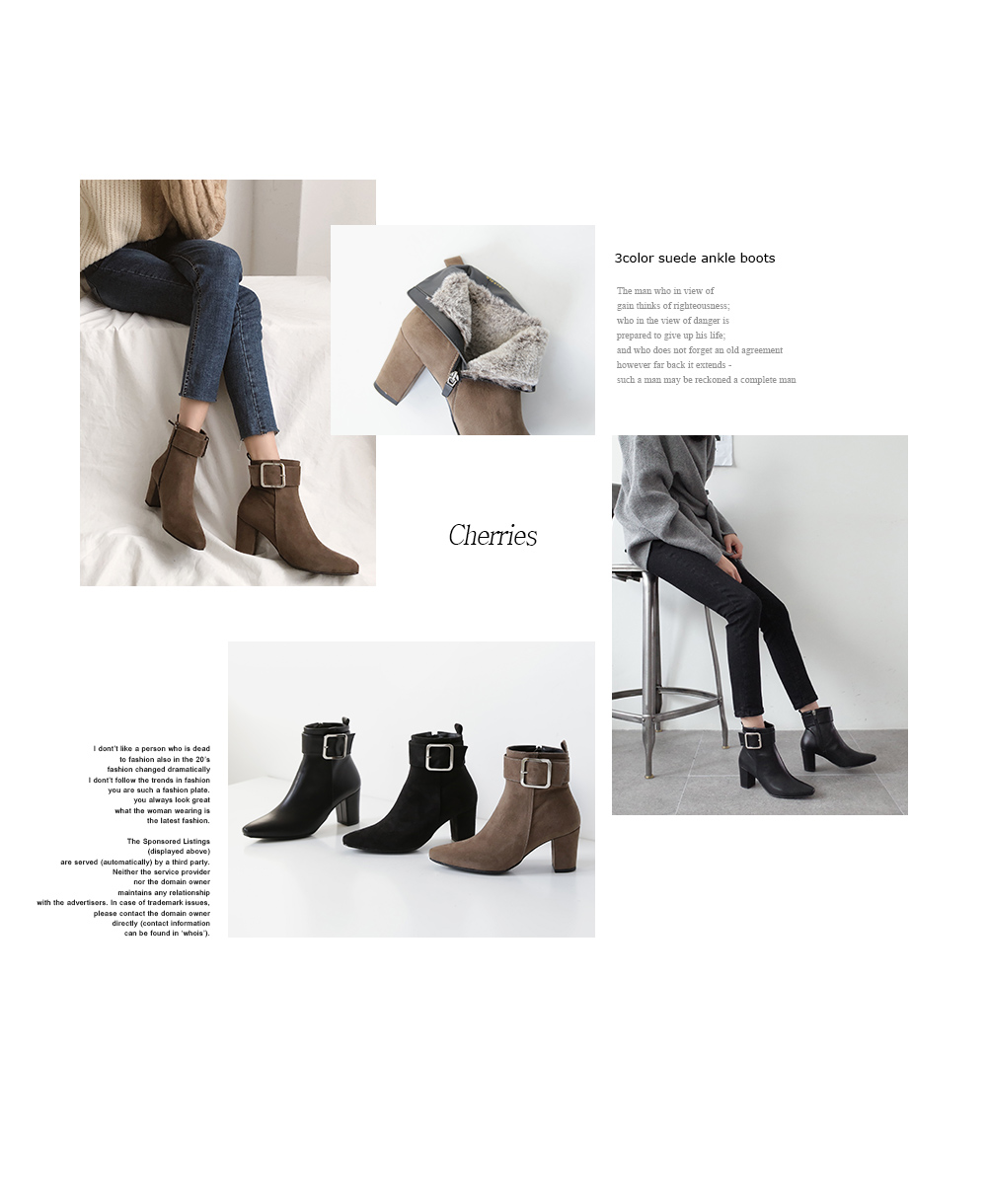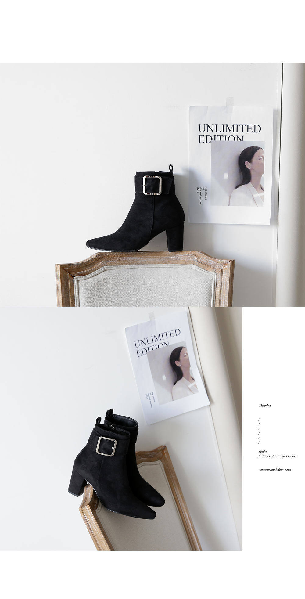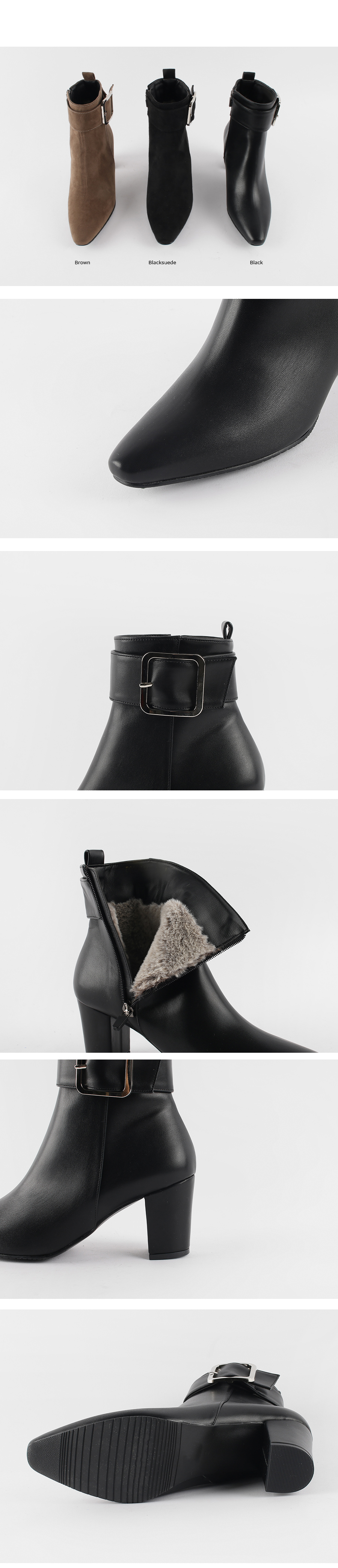 DETAILS - 소재 : 인조소가죽 / 인조스웨이드 - 컬러 : brown,black,blacksuede - 안감 : 옆면털 - 피팅감 : 정사이즈 / 무게 : 보통인편 - 착화감 : 안정감있는 굽라인으로 편안한 착화감이에요 - 모델피팅 : 235