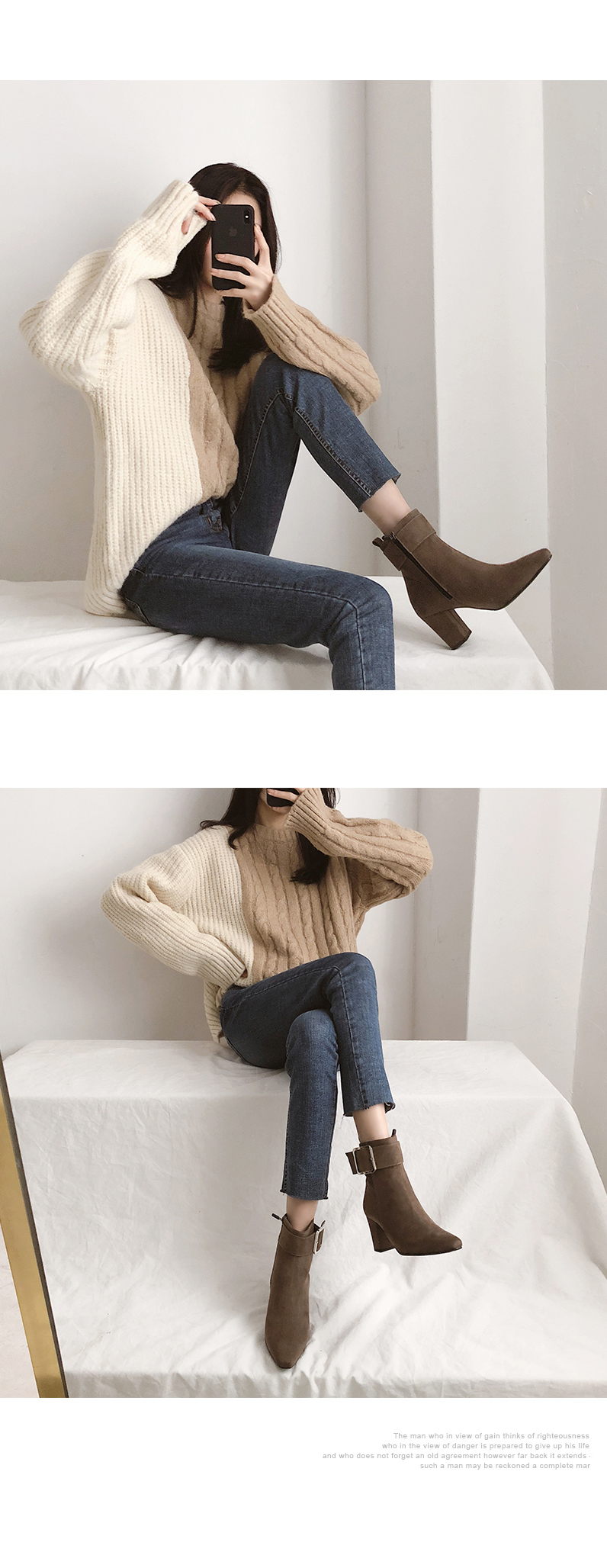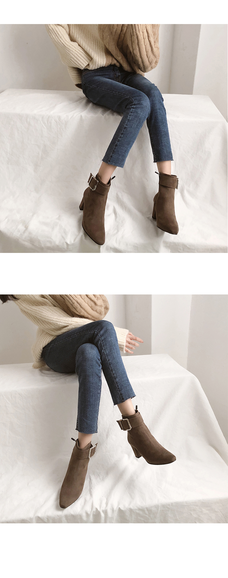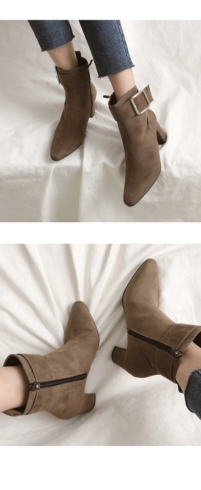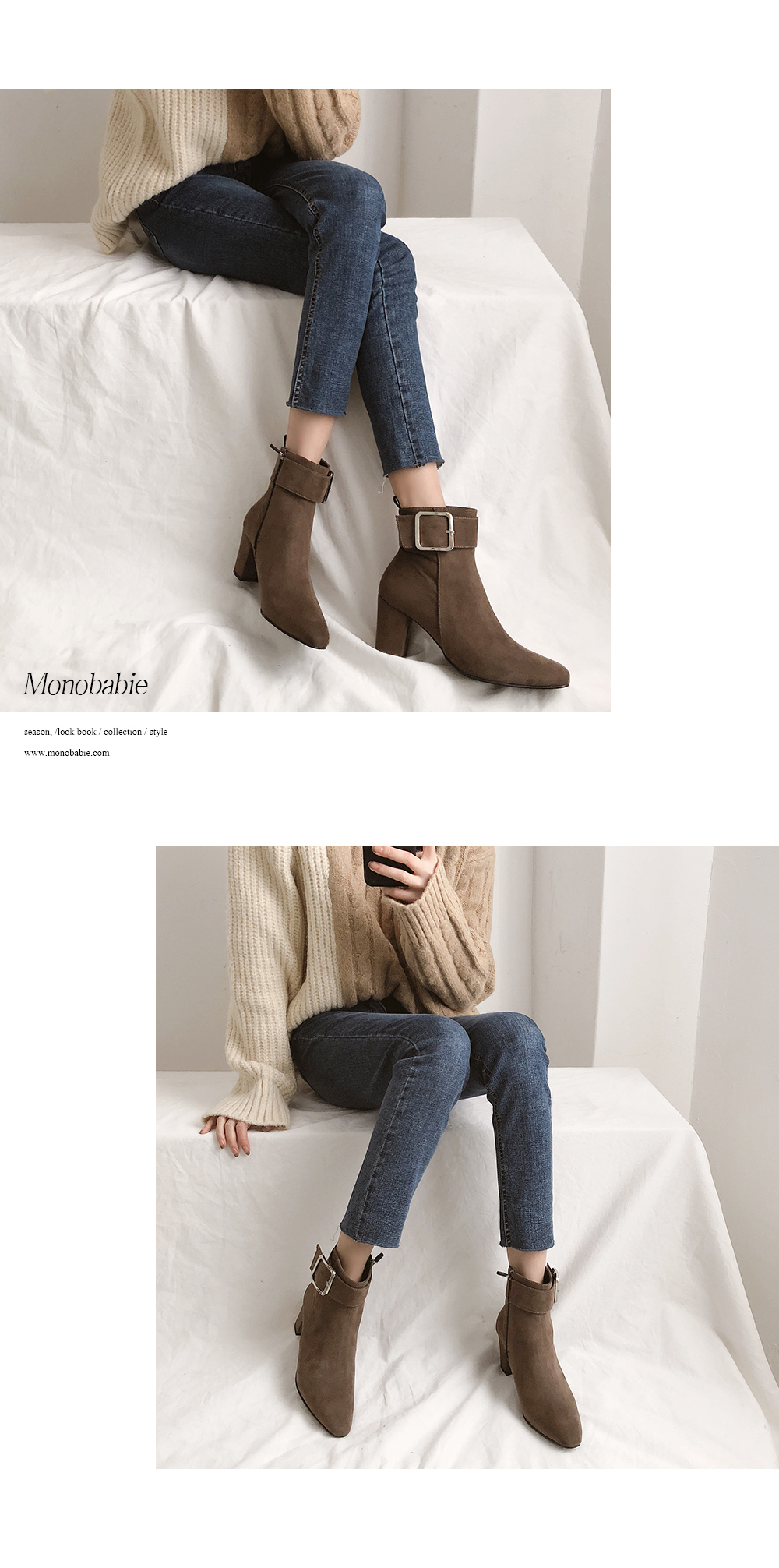 DETAILS - 소재 : 인조소가죽 / 인조스웨이드 - 컬러 : brown,black,blacksuede - 안감 : 옆면털 - 피팅감 : 정사이즈 / 무게 : 보통인편 - 착화감 : 안정감있는 굽라인으로 편안한 착화감이에요 - 모델피팅 : 235