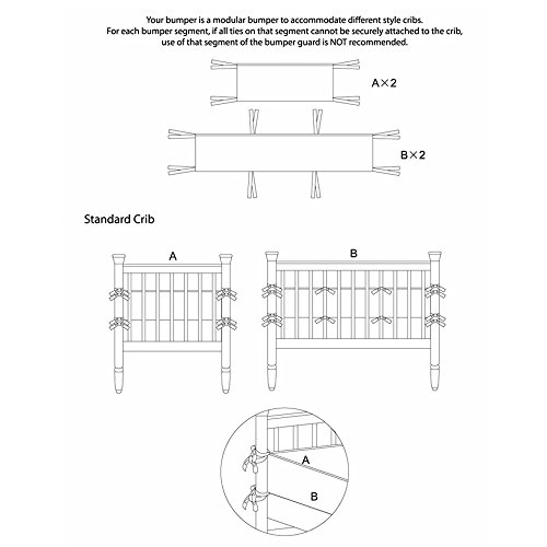SIZE & COLORS- 4-Piece Bumpers, 27"x52"x11". Fits standard cribs. Attaches easily with secure ties (8.5" Length). Available in white, pink, lt blue, lt green, grey, lavender and various patterns.