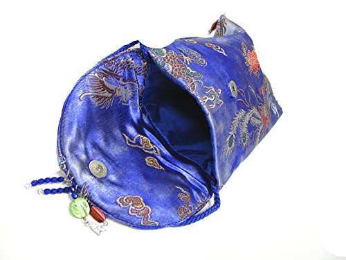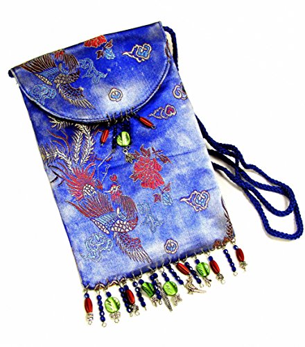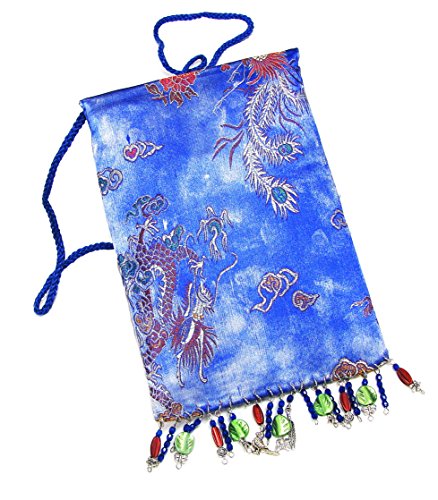 Linpeng Dragon, Phoenix,Peony Blue Brocade Beaded Tassel Small Shoulder Bag