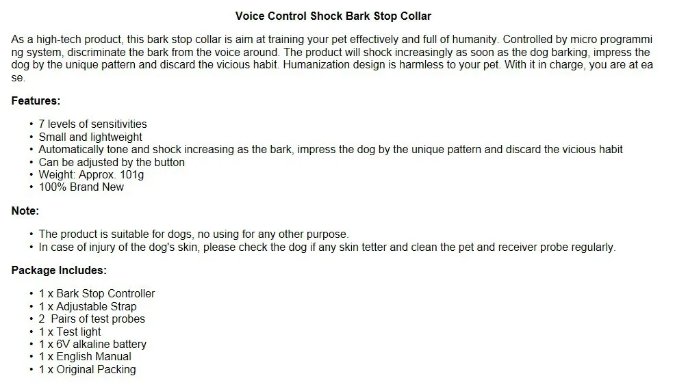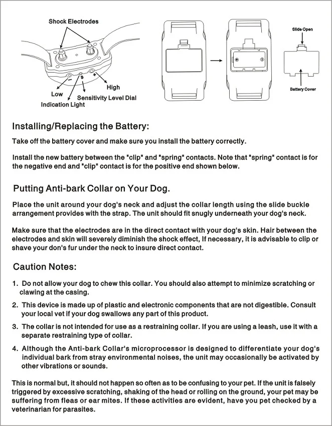 4.Although the Anti-bark Collar's microprocessor is designed to differentiate your dog's individual bark from stray environmental nosies・the unit may occasionally be activated by other vibrations or sounds.