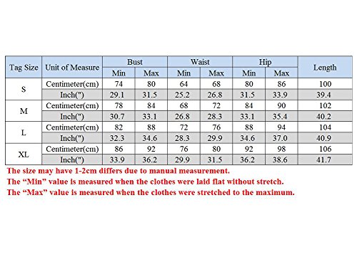Inch(") S=US 4-6: ---Bust: 29.1-31.5 ---Waist: 25.2-26.8 ---Hip: 31.5-33.9 ---Length: 39.4