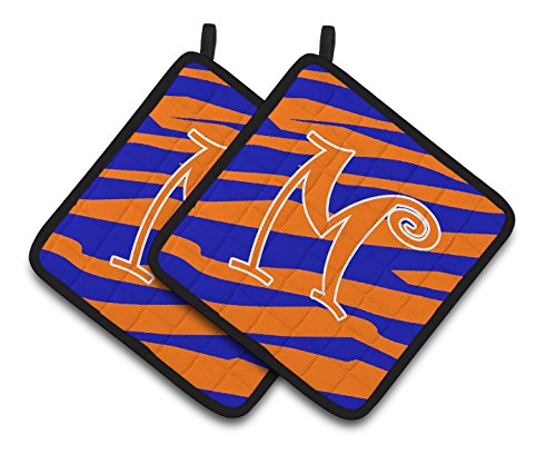 Caroline's Treasures Monogram Initial M Tiger Stripe Blue & Orange Pair of Pot Holders CJ1036-MPTHD, 7.5HX7.5W, Multicolor