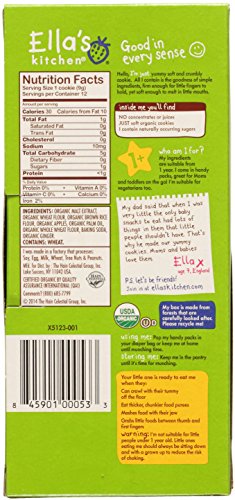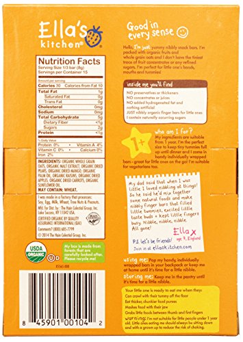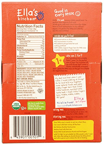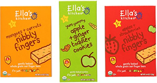 Ella's Kitchen Nibby Fingers and cookies are a delicious and nutritious way for your toddler to satisfy his or her hungry little tummy. All Nibbly Fingers are made with organic fruits, vegetables, and whole grain oats. No concentrated juices or refined sugars are contained in any Nibbly Fingers or cookies. Only the best ingredients for your child. This bundle includes: (1) 3.8oz box of apple and ginger cookies, (1) 4.4oz box of apples & strawberries nibbly fingers, and (1) 4.4oz box of mangoes & carrots nibbly fingers. There are five individually wrapped bars per box of Nibbly Fingers and 12 individually wrapped cookies per box of apple and ginger cookies. Nibbly Fingers and cookies are suitable for children from 12 months and older.