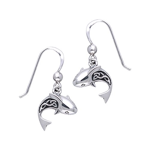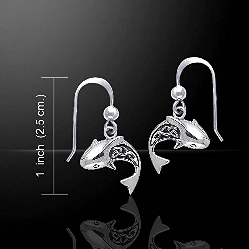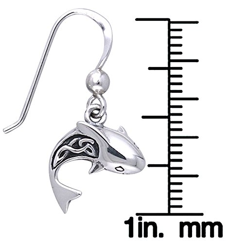 Welcome the beauty of the sea with this pair of well-defined shark earrings. These earrings are crafted of highly polished .925 Sterling Silver and showcase sharks with beautiful Celtic knotwork designs. This fascinating pair of earrings dangles from hook findings for an eye-catching look. Make a splash with these Celtic shark designed earrings.Feature