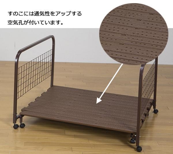 | 抗菌樹脂を使用しているので、とっても衛生的!!梅雨時や夏場も快適な布団収納ラックです。すのこ部分がスライド式なので、収納スペースに合わせて幅を調節することができます。移動や布団の出し入れも楽になるキャスター付き。 |