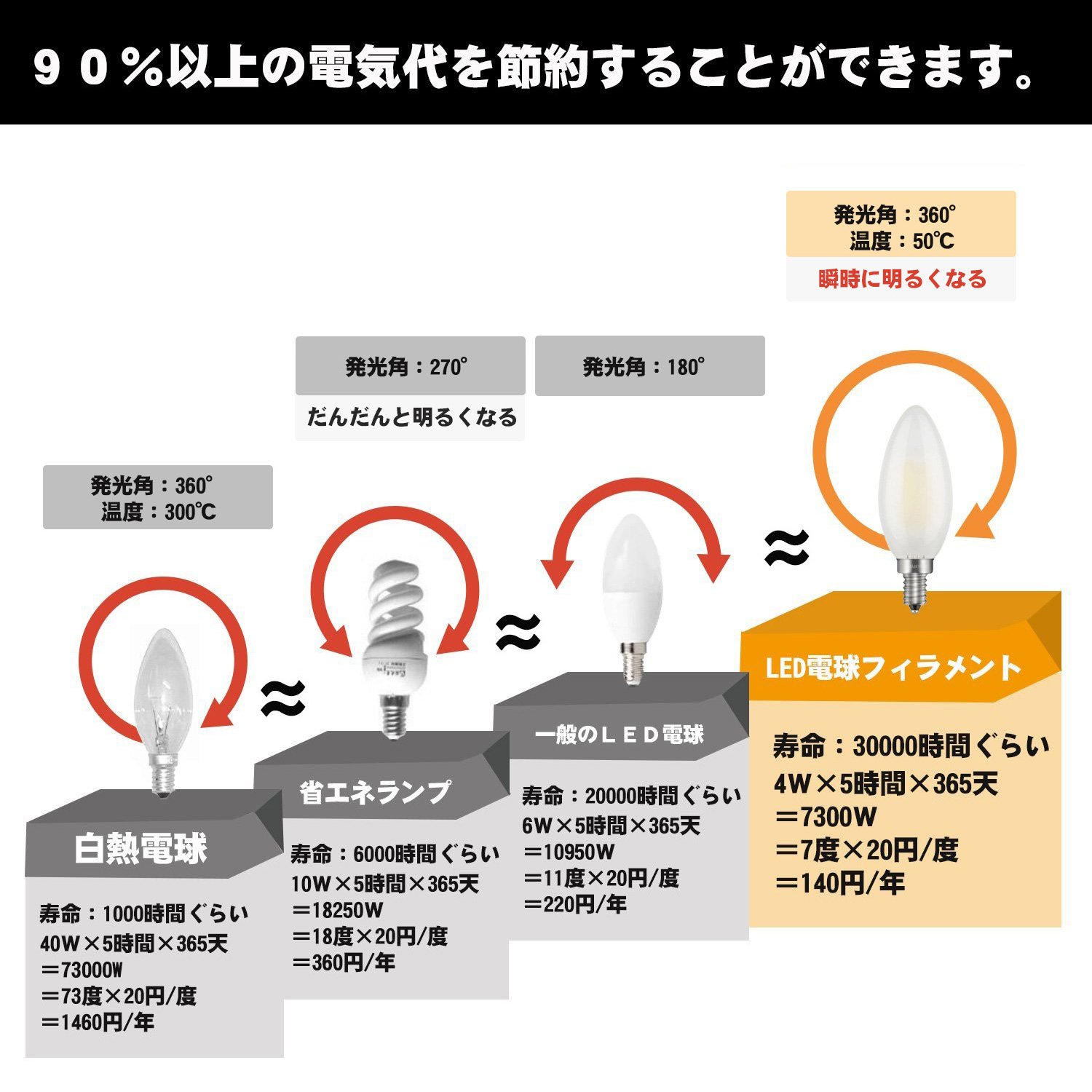 Includes candle type of E12 / E26, A60 Apple type, Edison type of ST64, Foam type of G45 / G50 / G80 / G95 / G125, tubular shape of T30 / T45,